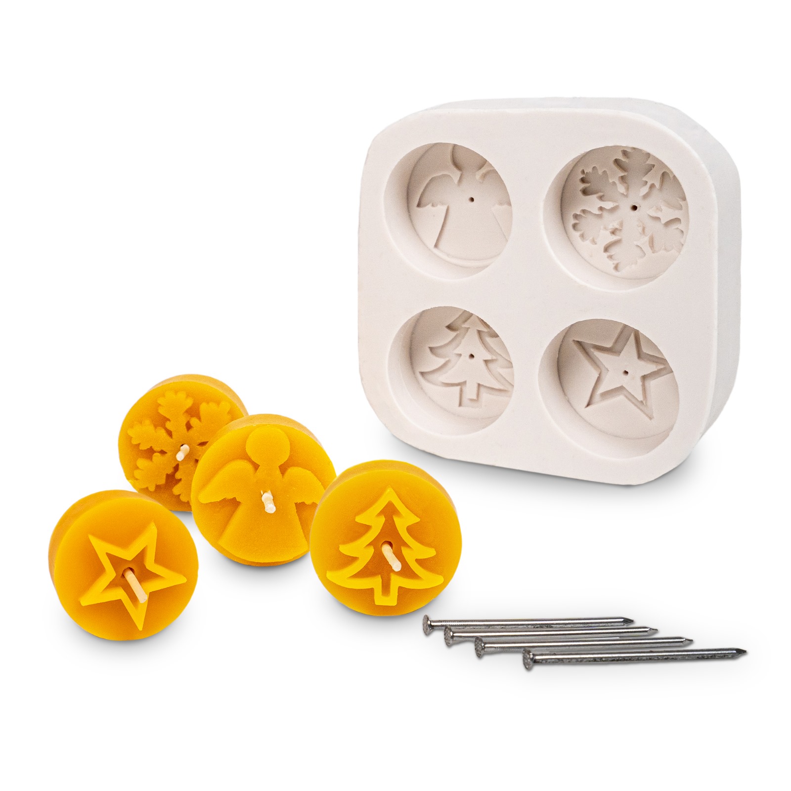 Mit dieser stimmungsvollen Silikon-Gießform für 4 Teelichter zaubern Sie im Handumdrehen weihnachtliche Lichtakzente. Die liebevoll gestalteten Motive Stern, Schneeflocke, Weihnachtsbaum und Engel machen diese Form zur perfekten Wahl für DIY-Geschenke, Adventsdekoration und winterliche Bastelideen.